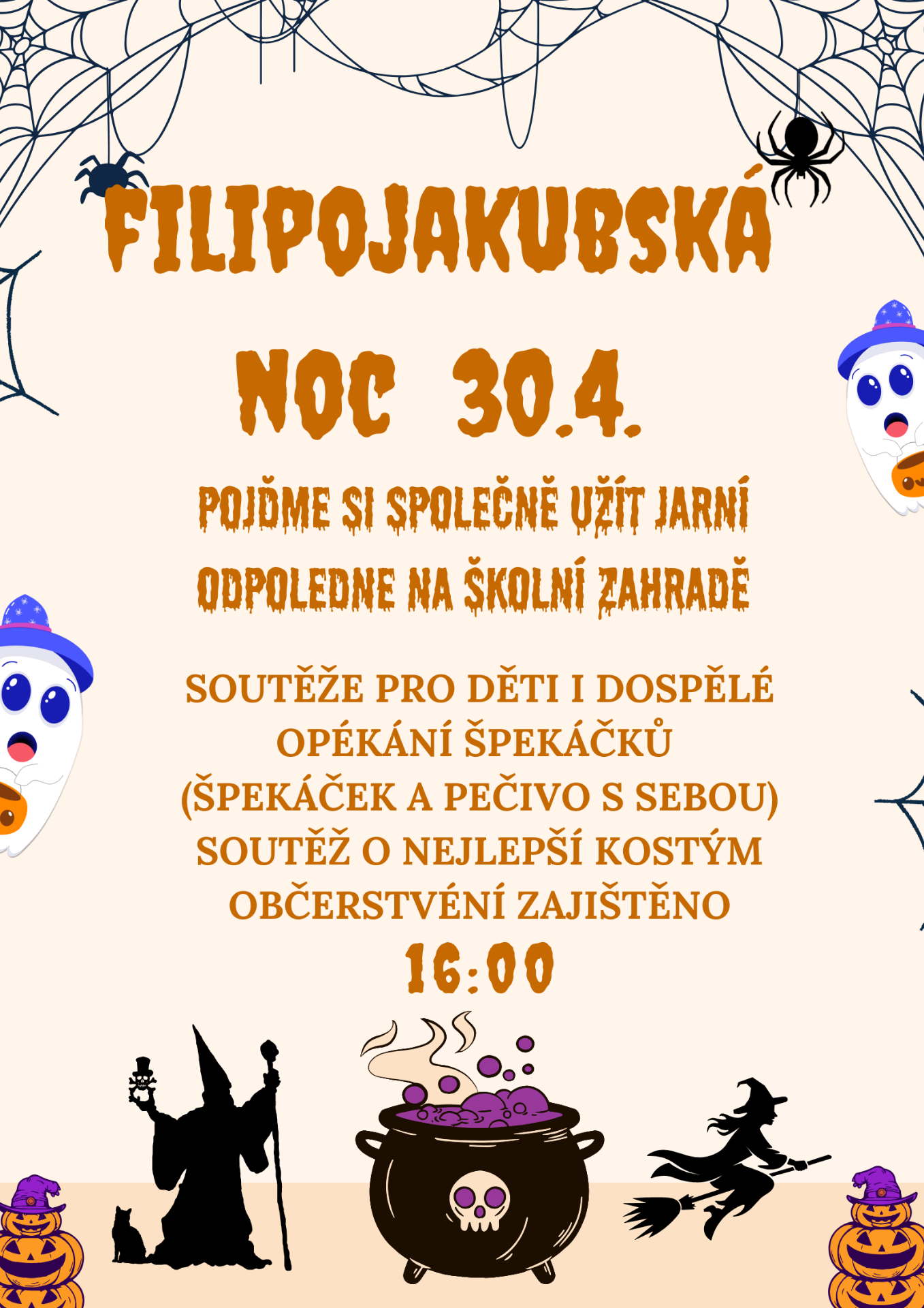 Srdečně zveme všechny rodiče, děti i přátele školy na společné setkání při příležitosti Filipojakubské noci, které se uskuteční ve čtvrtek 30. dubna 2026 od 16:00 hodin na školní zahradě. Přijďte si užít příjemné jarní odpoledne v přátelské atmosféře, potkat známé tváře a strávit čas v pohodě a klidu.