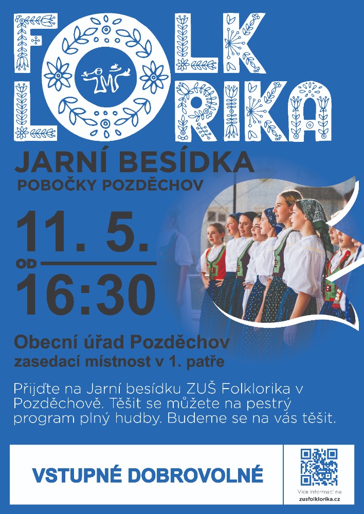 ZUŠ Folklorika vás srdečně zve na Jarní besídku žáků pobočky Pozděchov. Přijďte si užít odpoledne plné hudby, radosti a dětských vystoupení v přátelské atmosféře.