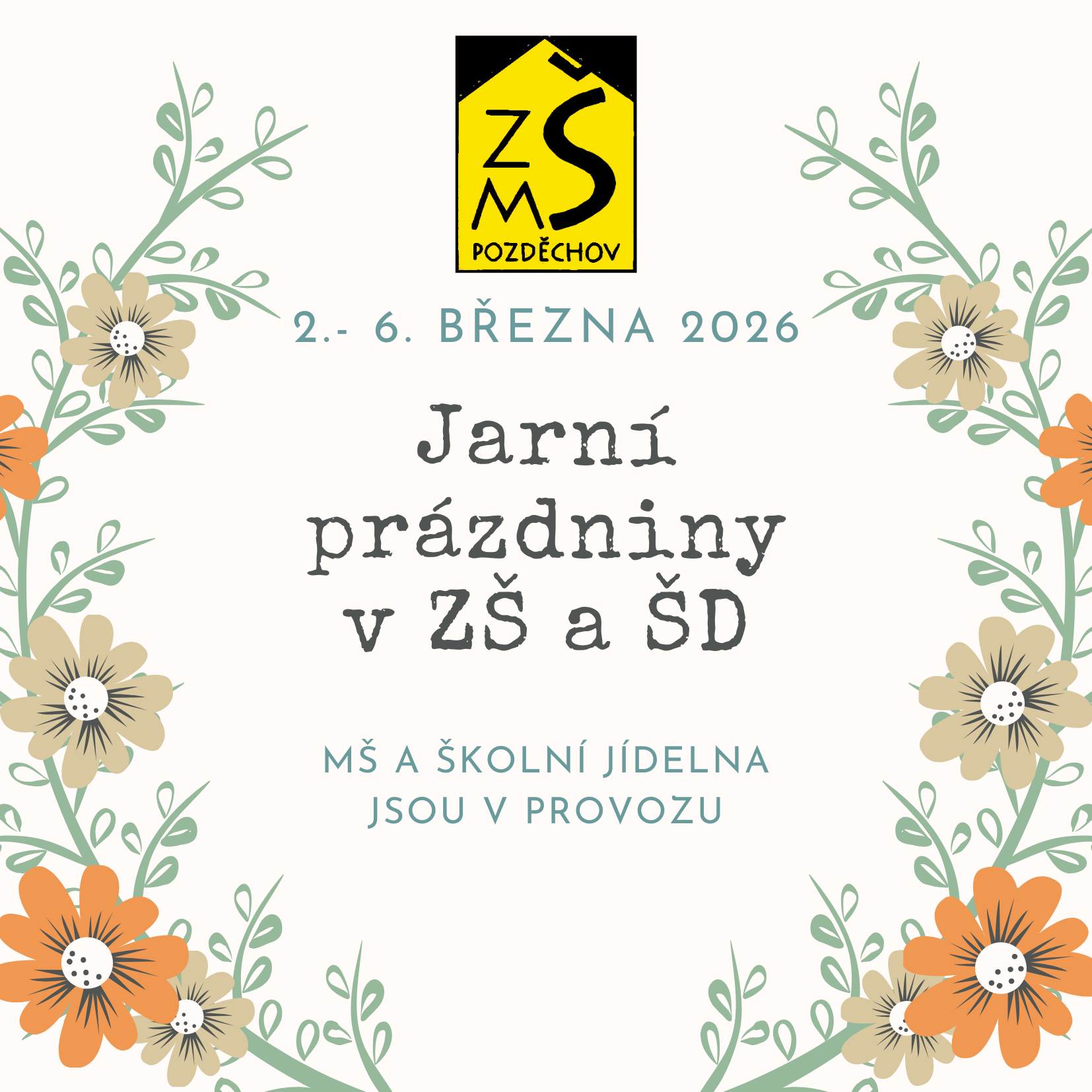 od 2. 3. 2026 začínají v Základní škole jarní prázdniny. Výuka bude znovu zahájena v pondělí 9. 3. 2026.