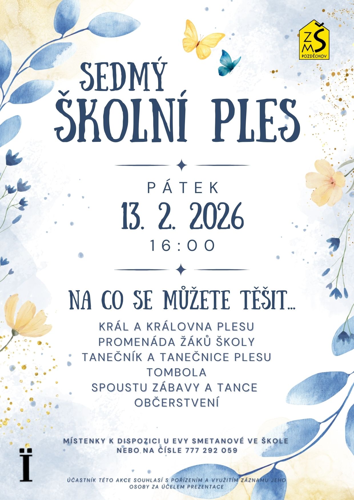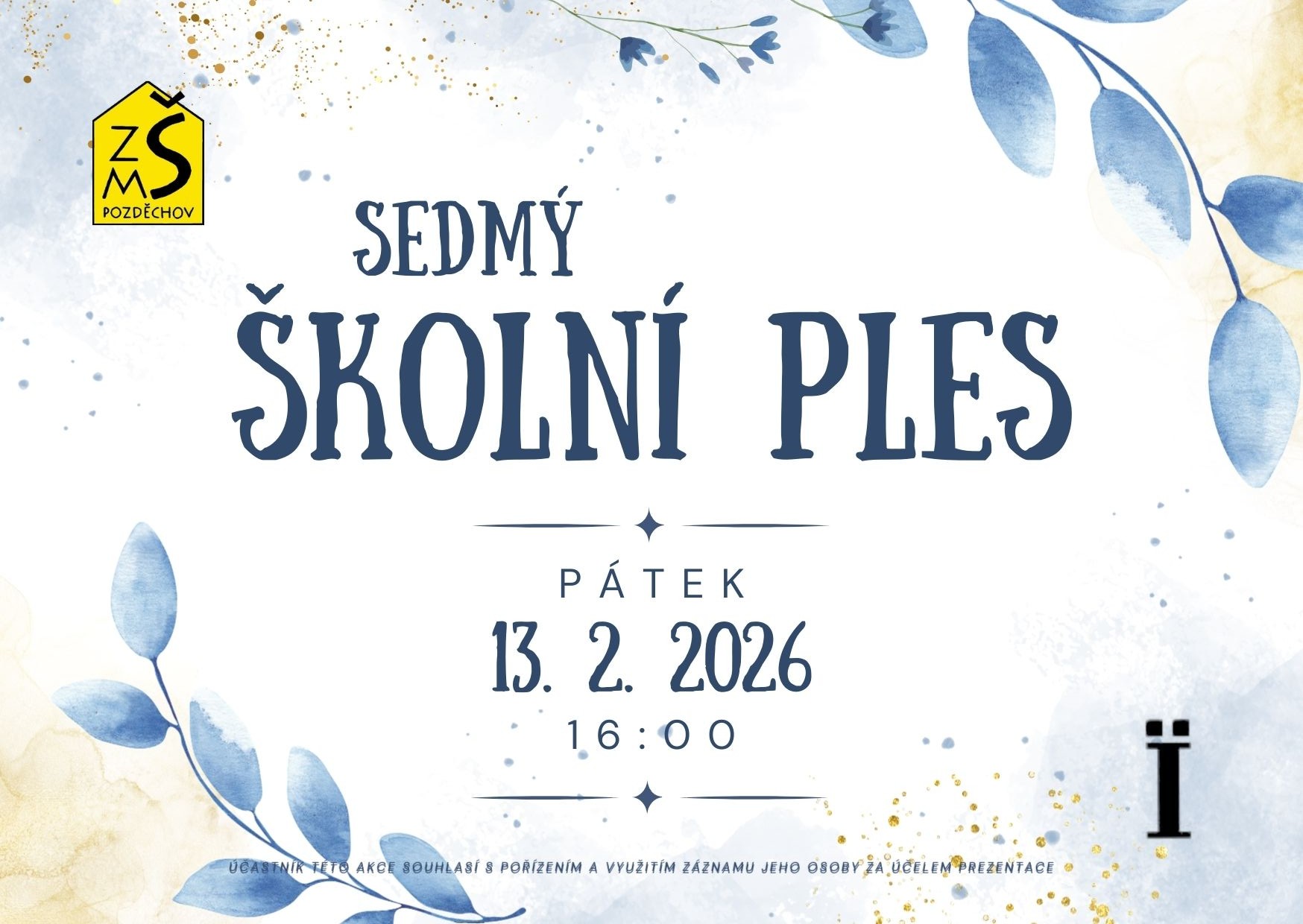 Zveme vás na 7. ročník školního plesu, který se koná 13. února 2026. Tradičně se těšíme na rodiče, děti, pedagogy i všechny přátele školy – bude to večer plný hudby, smíchu a skvělé nálady!