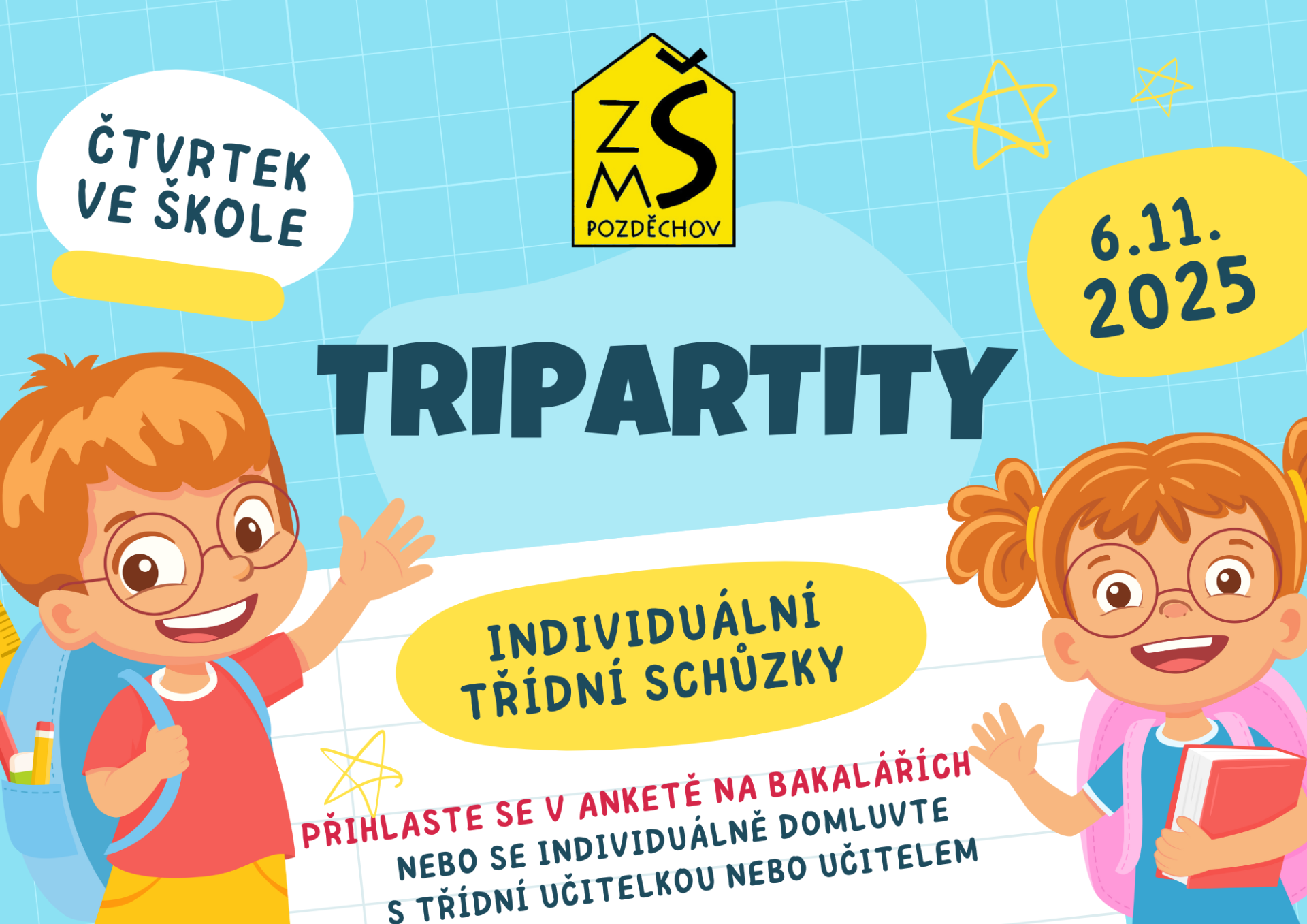 🕓 Prosíme rodiče, aby se zapsali do ankety na Bakalářích a zvolili si čas schůzky tak, aby to vyhovovalo všem zúčastněným.