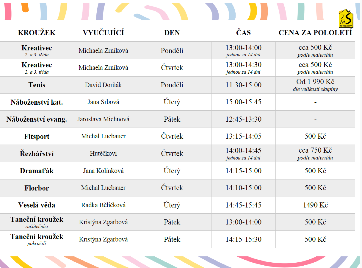 na školní rok 2025/2026 jsme pro vás opět připravili pestrou nabídku zájmových kroužků. Věříme, že si každý najde to své – ať už se zajímá o sport, tvoření, hudbu, vědu, angličtinu nebo dramaťák.