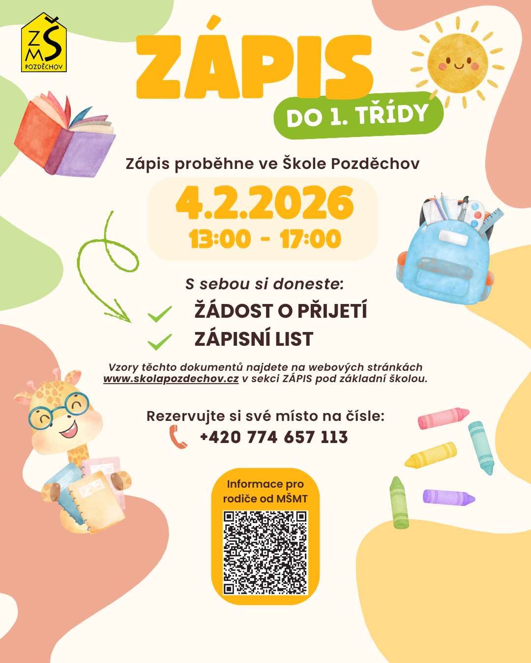 Srdečně zveme rodiče a jejich předškoláky k zápisu do 1. třídy, který proběhne 4. 2. 2026 od 13 do 17 hodin v naší škole.