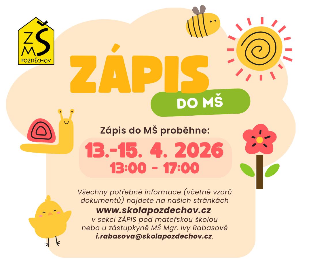 Zápis do MŠ proběhne 13.–15. 4. 2026 od 13:00 do 17:00. Všechny potřebné informace včetně dokumentů jsou k dispozici na: https://www.skolapozdechov.cz/zapisms.